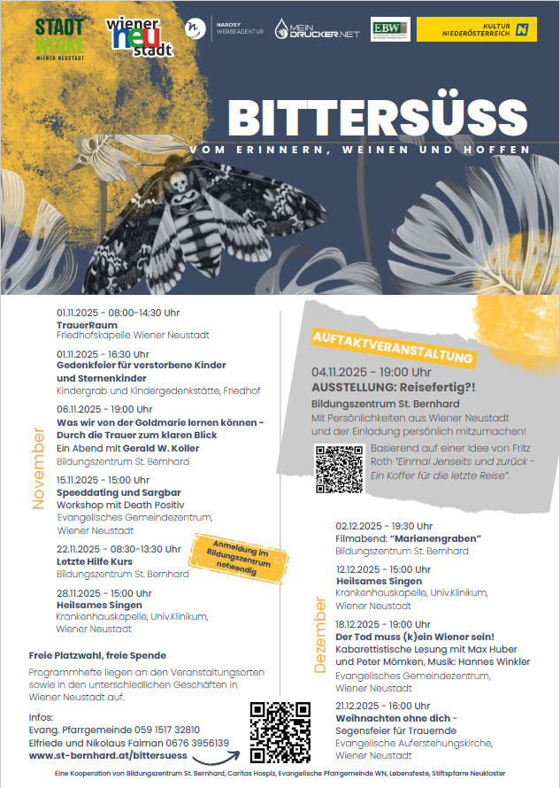 Eine Veranstaltungsreihe zum Thema Trauern in Kooperation von Bildungszentrum St. Bernhard, Caritas Hospiz, Evangelische Pfarrgemeinde WN, Lebensfeste, Stiftspfarre Neukloster